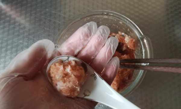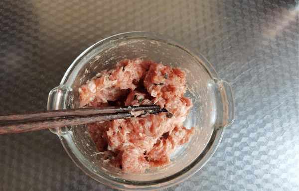 第三步:将葱花放入肉馅中,加盐少许,糖一茶匙,料酒半杯,蚝油一勺,生抽一勺,加入蛋清,搅拌肉馅2、3分钟,稍微等一下,就证明肉馅是正确的。