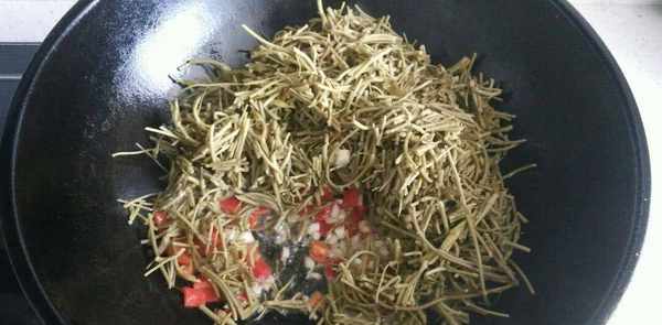 烹饪步骤4:加入一些荸荠菜用大火翻炒,加入一些小米椒翻炒几下,快速翻炒几下。