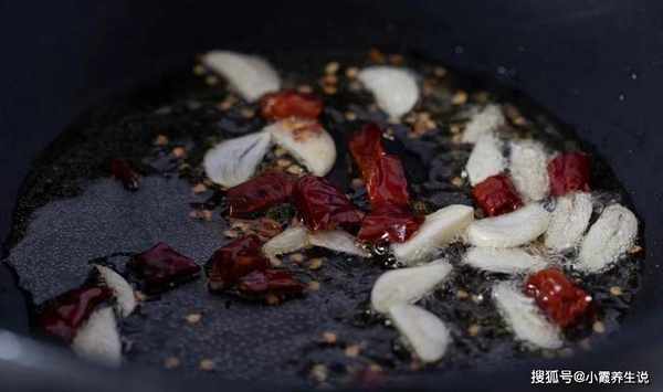 第三步:锅底放少许植物油和猪油,猪油全部融化,油热后加入花椒爆香,然后加入干辣椒和蒜瓣翻炒15秒左右。