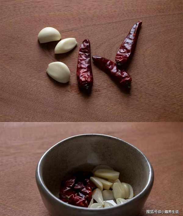 第二步:撕去南瓜尖表面的绒毛(也就是茎表面的那层皮),切成等长的部分,剥去外皮的蒜瓣数个,大蒜切成蒜片,将干辣椒洗净切段,备用。
