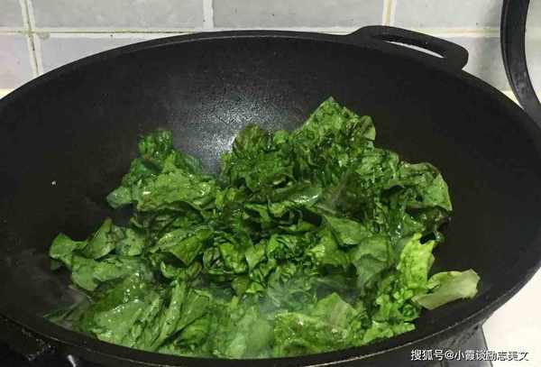 第五步:加入压碎的生菜叶,让叶子变软,加入少许酱油、少许盐和少许鸡精快速拌匀。