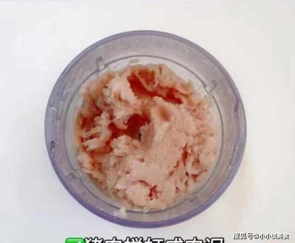 3:瘦猪肉去油,瘦肉切成小块,放入料理机,加入姜片和洋葱,将猪肉磨成泥。