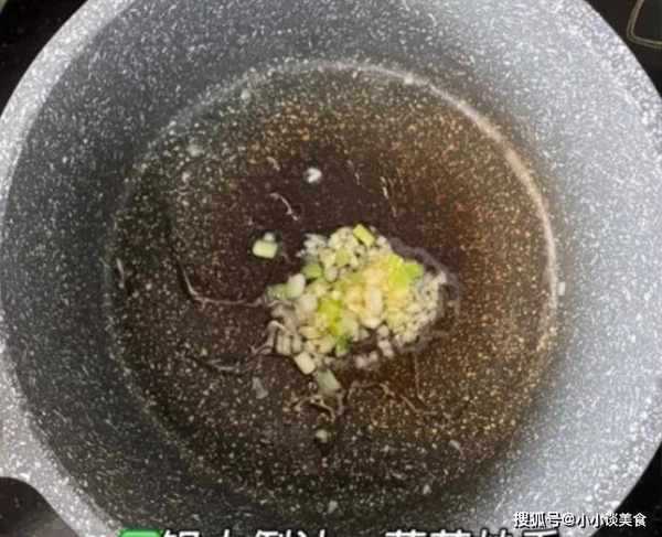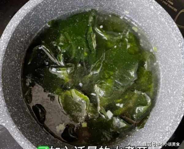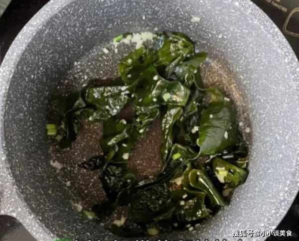 6:锅底加少许油,放入姜末和蒜末,加入裙带菜翻炒至光滑,加入适量的水烧开。