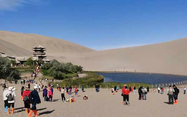 敦煌除了莫高窟之外,还有一处诸多自然景观中的佼佼者——月牙泉,形似弯曲如新月因此得名“月牙泉”(古称沙井、药泉),素有“沙漠第一泉 ”之称。在世人的认知中,沙漠就是完全被沙丘覆盖,植被、雨水稀少,空气炎热干燥的荒芜地区,但在月牙泉却是另一幅景象。沙丘环绕包裹着一湾清澈的泉水,一望无际的金色大漠中点缀着一点绿色。