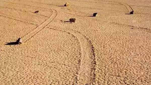 在加利福尼亚州的死亡谷,这些岩石在没有任何人为或动物干预的情况下沿着谷底移动。