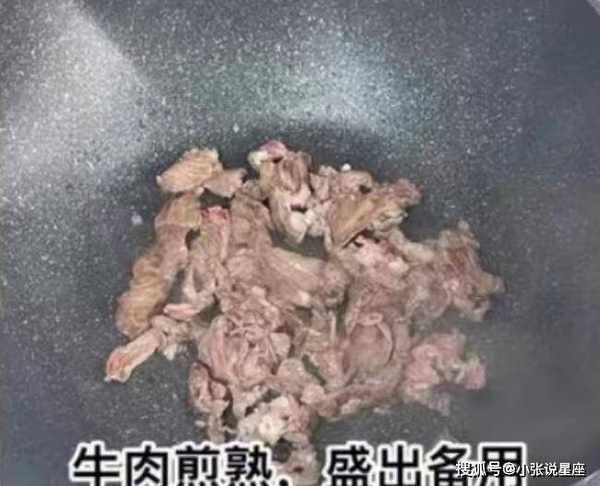 4:锅底放少许橄榄油,倒入少许牛肉片,别忘了用中火慢慢煎,牛肉片会变色,大概7到8成熟就可以上桌了。