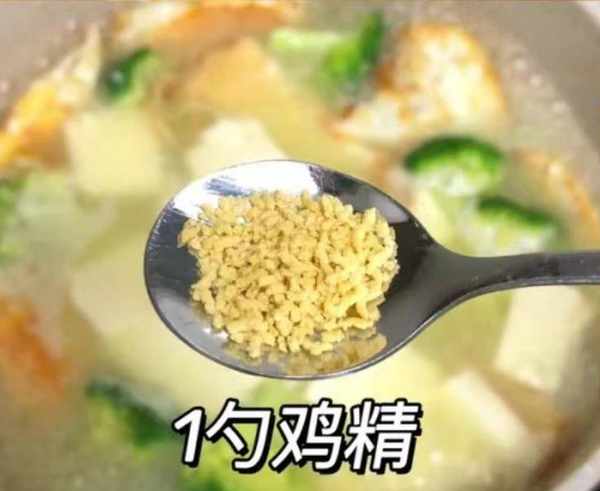 第六步:加入几大碗开水,依次加入西兰花和豆腐块,等汤煮到奶白色时,加入一些虾或虾皮(记得如果可以加一点,会出汤的更美味)