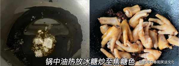 第四步:锅底放食用油,加入冰糖炒至糖色变色,加入鸡腿用旺火炒,待鸡腿熟透变色。换,加入八角、花椒、桂皮和香油,快炒均匀,让香味出来。