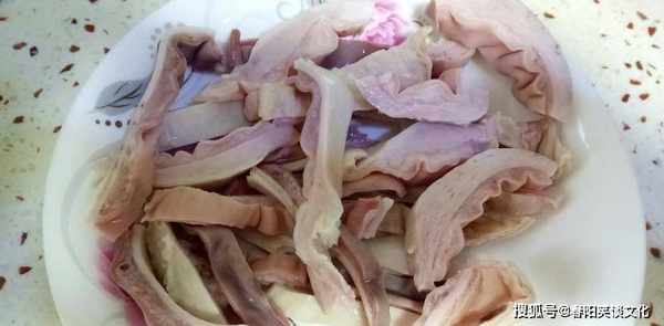 第三步:用白醋浸泡新鲜五花肉的外面,也可以用少许面粉洗净。用剪刀剪掉肚皮内壁的赘肉,在肚皮内壁涂上少许面粉,搓几下,加入白酒和白醋,撒少许食盐,食盐可以杀菌、白酒和白醋可以去除腥味,面粉会吸附内壁的杂质,重复三遍,直到猪肚洗水很清澈。