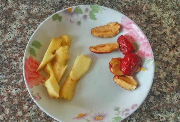 第三步:红皮花生去皮,花生用冷水泡发,红枣去核对半切开,生姜切片待用。