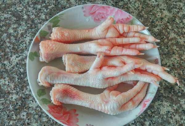 第一步:准备好以上材料,解冻几只鸡爪,将鸡爪清洗干净,去掉多余的部分,反复清洗鸡爪,捞出鸡爪沥干水分备用。