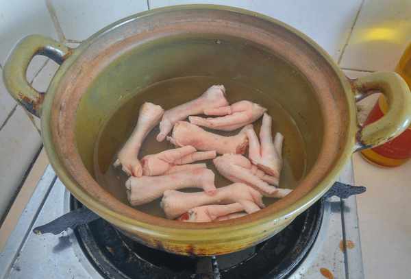 第二步:将炖锅洗净放入处理好的凤爪,加足量水,加入料酒,将凤爪用冷水煮5分钟,用冷水冲洗干净备用。