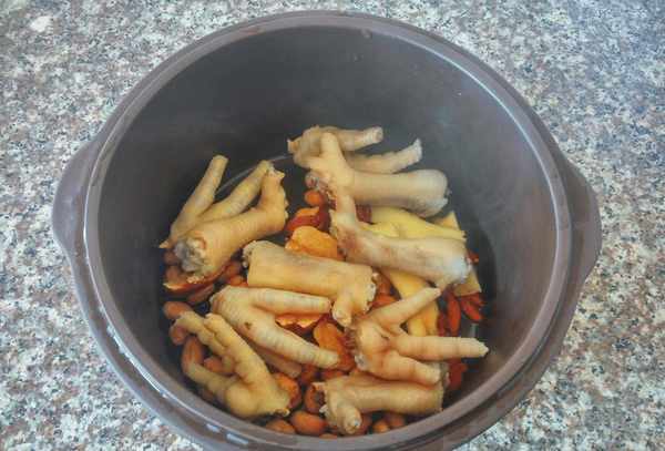 第四步:将凤爪、红枣、泡好的花生米、姜片放入炖锅中。记得加水,盖锅盖大火炖。