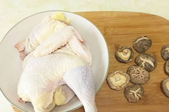 土鸡半只、花菇9朵、姜1小块、料酒1汤匙、盐少许