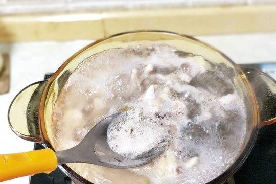 6.烧开后,有浮沫的用勺子撇去浮沫