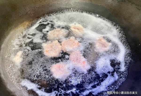 步骤5:用一个勺子挑出虾仁泥,挤成若干虾滑,挑入锅中,大火将虾滑煮一煮,让虾滑全部浮上来,证明虾滑煮熟了。
