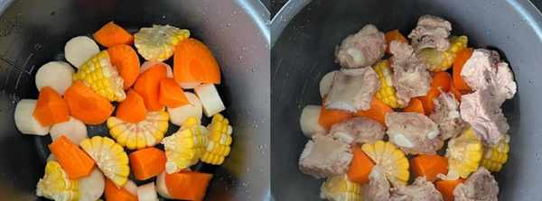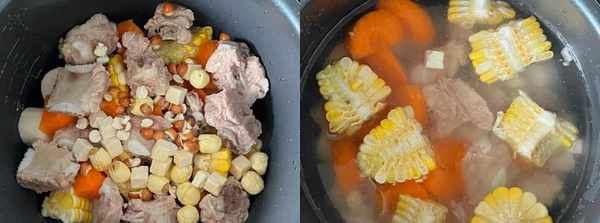第五步:汤锅中放入玉米、山药,放入胡萝卜适量,焯水后加入排骨,依次加入茯苓、芡实、莲子,加适量水,盖上锅盖,大火慢炖。