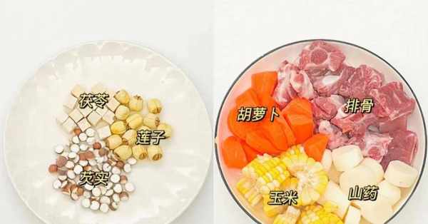 选料:买干莲子15克左右,芡实10克,茯苓12克左右,上等排骨300克左右,胡萝卜一根(建议买粗的胡萝卜,细的胡萝卜适合油炸和凉拌,粗一些比较耐煮),山药一块(也可以选马蹄,炖出来的汤更甜),粘玉米半个,水适量,热水少许,少许料酒、姜一片、盐少许、白胡椒粉、其他调料。
