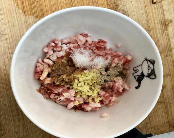 第二步:加入姜末、白胡椒粉少许、香料十三茶匙、盐适量、生抽少许、肉末酒一茶匙,搅拌肉末,将肉末腌好。肉18分钟。