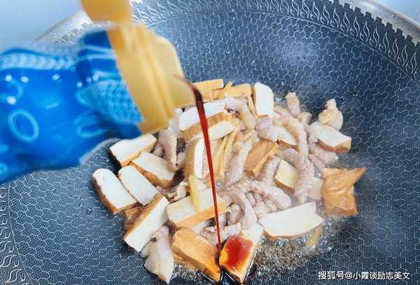 第六步:根据自己的口味调味,加入足量的盐,少许鸡汤和味精,加入生抽,半勺蚝油,快速将豆腐干炸至光滑。.