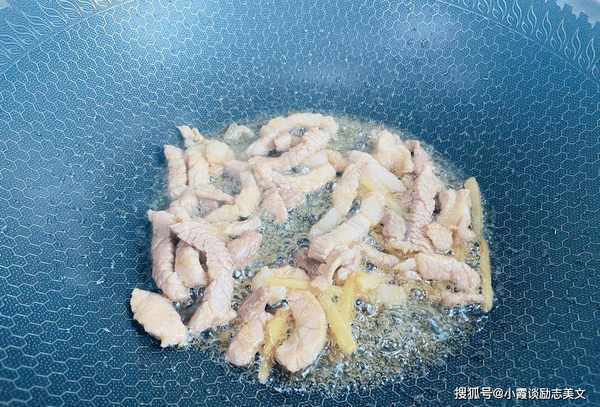 第四步:锅中加入适量食用油,油温升高,放入切好的炒好的姜片,加入腌好的卤肉,这样瘦肉就拌匀了。