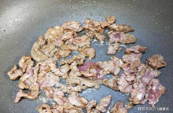 5:大蒜、生姜各切几片成细丝,锅洗净烧热,倒入腌制好的肉片,快速煎肉片,肉片颜色变白。