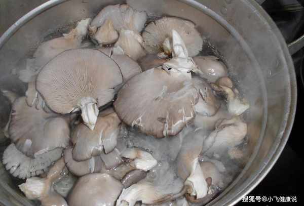 3:之前的焯水不要倒,平菇入锅煮开,去除平菇的异味,挤出水分撕成细丝,控干平菇出水备用。