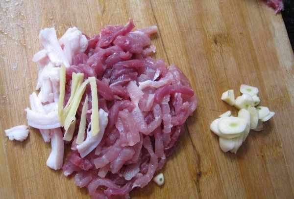 第三步:猪肉洗净,瘦肉切成细条,放入容器中,加少许胡椒粉、少许酱油、2汤匙淀粉分几次包好,瘦肉特别入味不易老化。