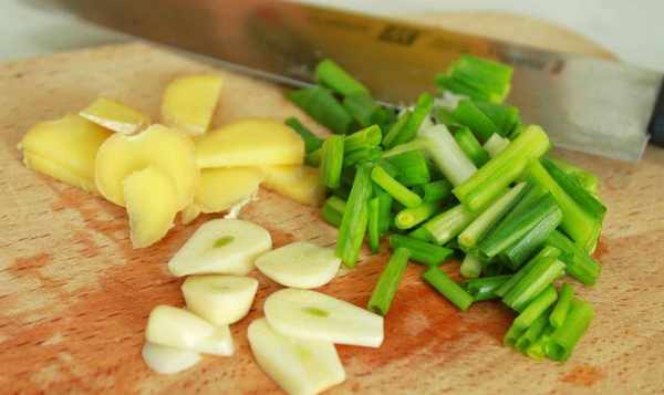 第二步:大蒜全部剥去外皮,去根切大蒜片,姜全部切成细条,干辣椒切成细条备用。