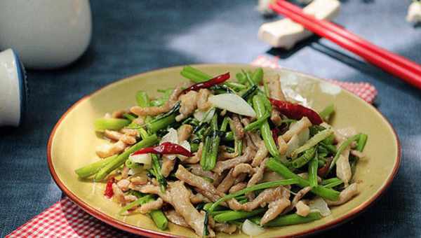 空心菜梗炒瘦肉条是一道营养健康的菜肴。空心菜茎中含有草酸,含有丰富的钙质、铁质和钾质,与瘦肉搭配口感极佳。它特别容易消化。你可以为你的家人多吃这道菜。