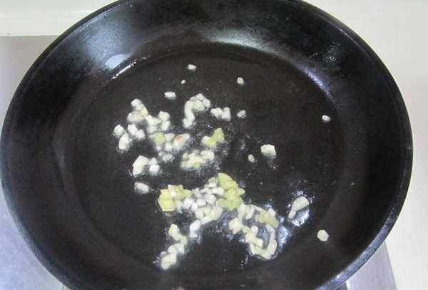 第五步:锅底留油烧热,加入蒜末、姜末,大火炒干辣椒,爆香。加入切碎的空心菜,炒至碎。