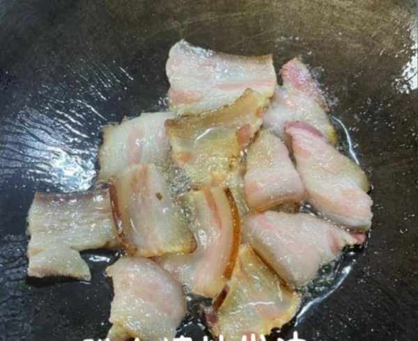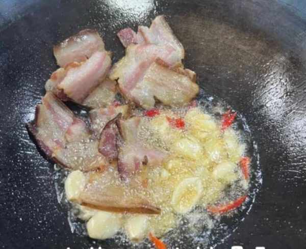 第二步:锅底加少许植物油,将腊肉倒入锅中,快速爆油,加入蒜片、小米椒和泡椒炒出香味。