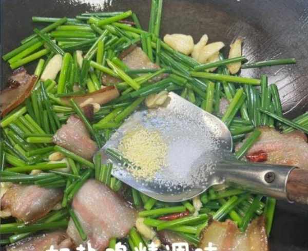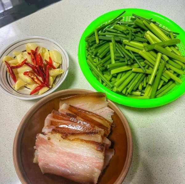 选料:买新鲜韭菜苔约150克(韭菜苔长到末尾有韭菜嫩尾,吃起来脆脆的,味道很好闻,最近很受年轻人的喜爱,跟猪肉或者腊肉,炸出来很香,满足胃口再吃),小米辣两两,植物油少许,优质腊肉一块(约300克,腊肉和腊肉不一样,腊肉的味道更香不腻,匈奴人特别喜欢),泡椒一对,生抽一勺,盐一勺,鸡汤半勺,淘米水少许,水适量其他调味料。