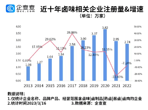 而卤味相关企业的注册数据,也在佐证行业受热捧程度。企查查数据显示,我国现存卤味相关企业18.45万家。且在2020年之前,卤味行业每年相关企业的注册量同比增速都在10%以上,2022年行业企业新增注册量为2.74万家,同比增速明显回升。