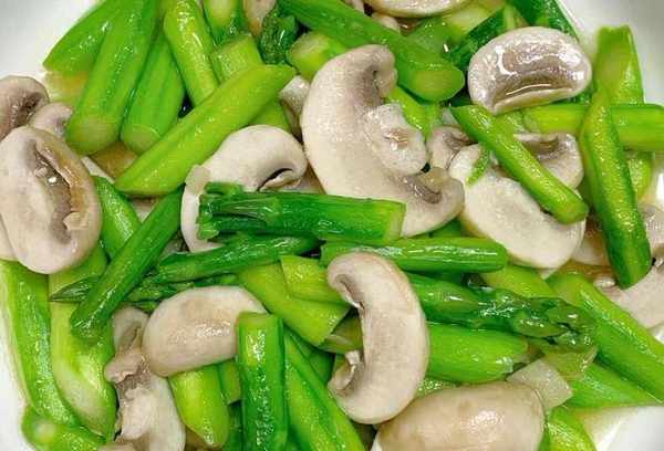 2、香菇洗净,切成片。在平底锅中加热油。当油热时,加入蒜末炒香。然后加入香菇翻炒片刻。当它们变软时,加入芦笋,炒至光滑。