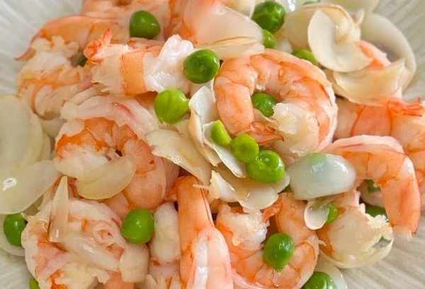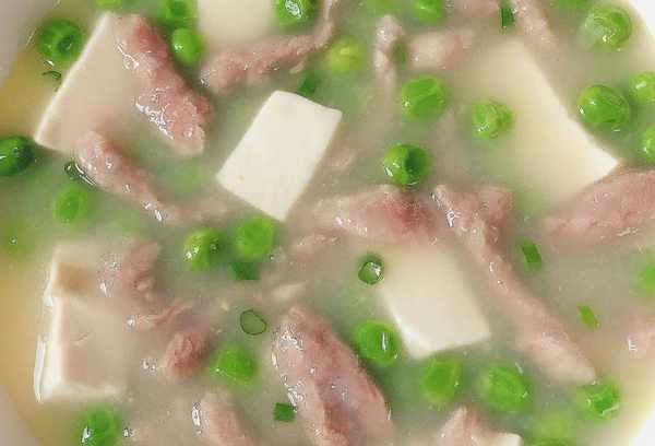 4.加入豌豆煮至浮起,然后加入嫩豆腐煮两分钟。5、豆腐煮熟后,加入腌好的肉片,煮两分钟至变色,最后加少许盐调味,拌匀煮熟即可出锅食用。