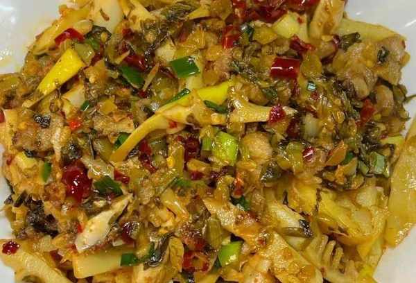 3.平底锅烧热,不放油,放入春笋稍炒干水,捞出备用。酸菜也是先炒,让水先收干,备用。