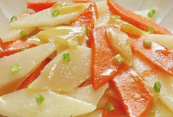 1.山药和胡萝卜用削皮刀去皮,洗净,切成菱形片。