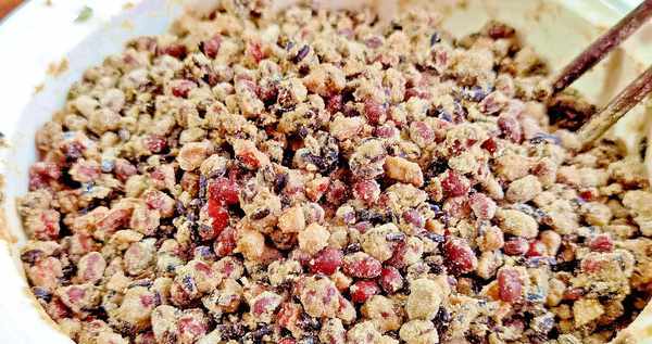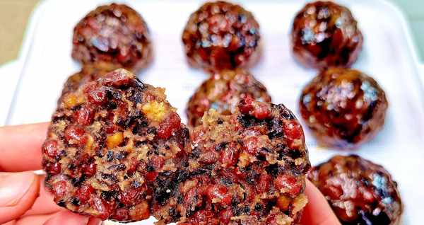 2.将红豆和黑紫米放入锅中,趁热加入适量红糖,搅拌均匀,再加入适量小麦粉,加入适量纯牛奶,拌匀。做一个同样大小的球,然后把球放在盛满沸腾米粉的碗里,滚一圈,盖上面粉。