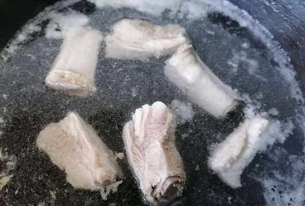 第二步:准备一个深一点的锅,把排骨或者骨头放在锅底,姜切少许扔进锅里,大葱洗净切成片,葱打结扔掉。入锅,加入黄酒和料酒,开火焯排骨。