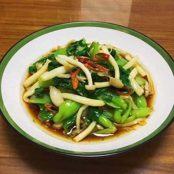 10 不需要加水,蟹味菇自己会出很多汤的,汤很鲜美。焖一会儿关火盛在铺好的油菜上面即可。