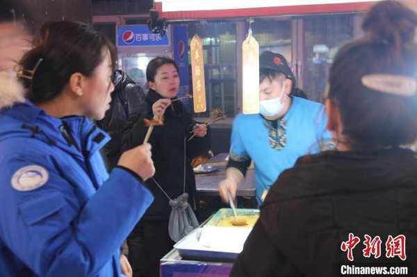 游客们围着小摊吃烤羊肠。 潘琦 摄