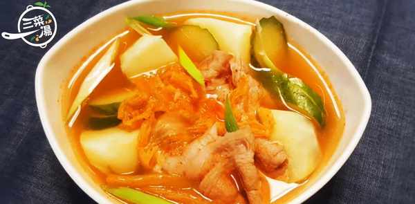 材料:土豆2个、牛肉片140克、香油25cc、黄瓜130克、韩国泡菜250克、大蒜3瓣、韩国辣椒粉5克、胡椒粉适量、鱼露140克、白糖10克,蒜苗45克