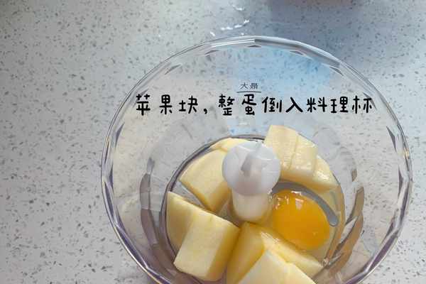 1.把100克苹果块,1个鸡蛋全部倒在料理机里搅打5分钟。PS.宝宝蛋清过敏的话也可以只加两个蛋黄替代全蛋。
