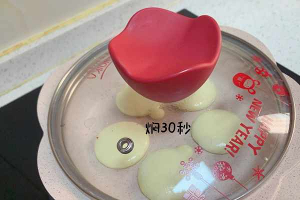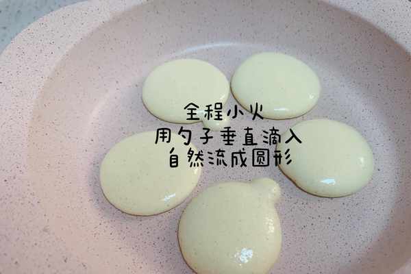 4.平底锅全程开小火,小火,小火,用勺子舀着面糊垂直滴入锅中,使其自然形成圆圆的小饼状,盖盖焖个30秒左右,翻面,继续焖另一面。