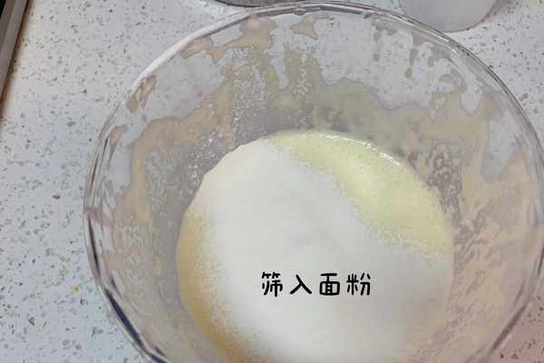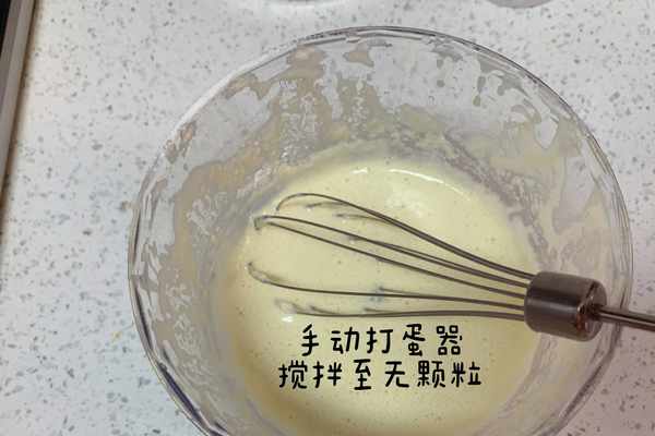 3.接下来筛入少许面粉,筛入的方式可以使面粉更细腻,用手动打蛋器搅拌均匀至无颗粒,最终是流动的面糊状就可以了,不要太稠了。