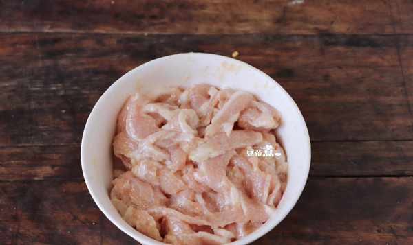 4、猪颈肉切成薄片,加入胡椒粉、盐、蚝油腌制15分钟,然后加入一勺淀粉和一勺油拌匀待用。