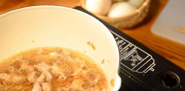 取一平底锅,烧热2勺油,爆香洋葱、虾米和香菇丁,然后放入五花肉翻炒几下。然后,倒入1.5茶匙黄酒、2汤匙酱油、150毫升清水(或清水)将香菇泡入锅中,搅拌均匀再煮一会,让五花肉上色入味酱油。
