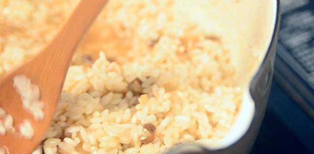 那就来先把五花肉拿下来,倒入泡好沥干的糯米。搅拌均匀,让糯米染上番茄酱的颜色,然后关火浸泡一会。