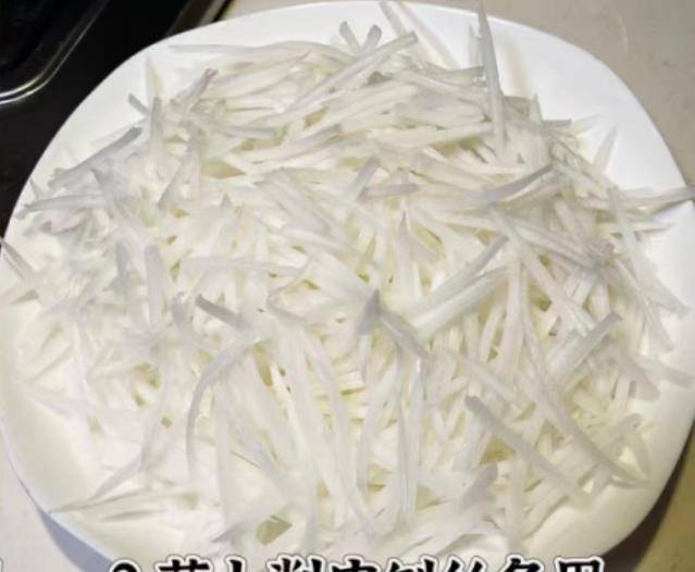 1:准备好白萝卜、牛里脊等材料,白萝卜洗净去皮,用工具将白萝卜磨碎,白萝卜用盐水泡一下,最后捞出沥干水分。